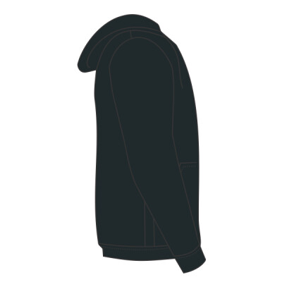 Raglan sleeve. Double-layered hood in self-fabric. Round drawcords in matching body colour with metal tipping. Metal eyelets. Inside herringbone back neck tape. Self-fabric half-moon at back neck. Slanted side seams with pockets. 1x1 rib at sleeve hem and bottom hem. Flatlock top-stitch on all seams.