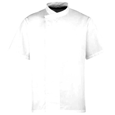 Culinary pull on short sleeve chef's tunic in easycare fabric. Short sleeve - Quick, pull on design. No buttons to fall away. Soft hand feel. Specifically engineered for user comfort. Mandarin collar stand with topstitching. Single press stud cross over c